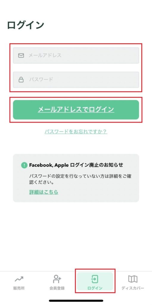 先ほど入力したメールアドレスとパスワードを入力し、「メールアドレスでログイン」をタップします。